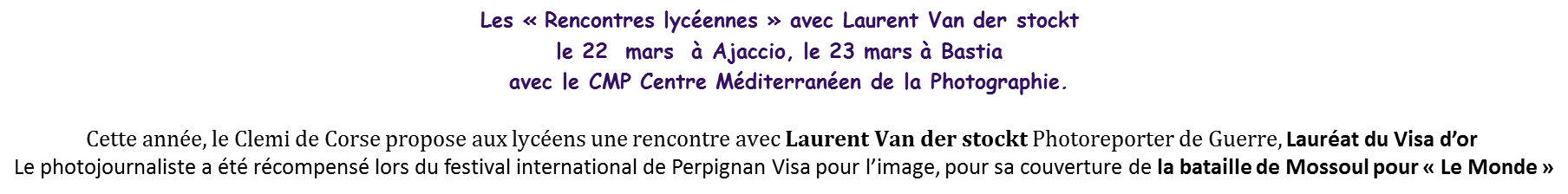 Cette année, le Clemi de Corse propose aux lycéens une rencontre avec Laurent Van der stockt Photoreporter de Guerre, Lauréat du Visa d’or