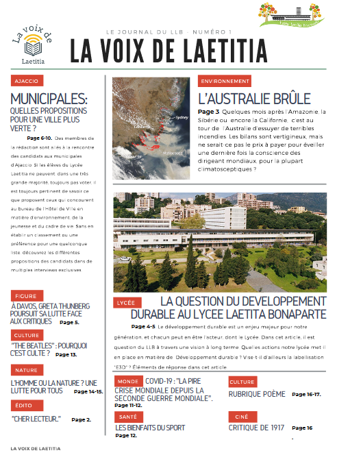 Initié par le Conseil de Vie Lycéenne, voici le premier numéro du journal du Lycée Laetitia, préparé et rédigé par les journalistes-élèves. Ils ont bravé la météo, les grèves, la Covid19, la fermeture du lycée depuis le 9 mars, le confinement, la fin du bac ... et le numéro 2 est déjà sous presse !
